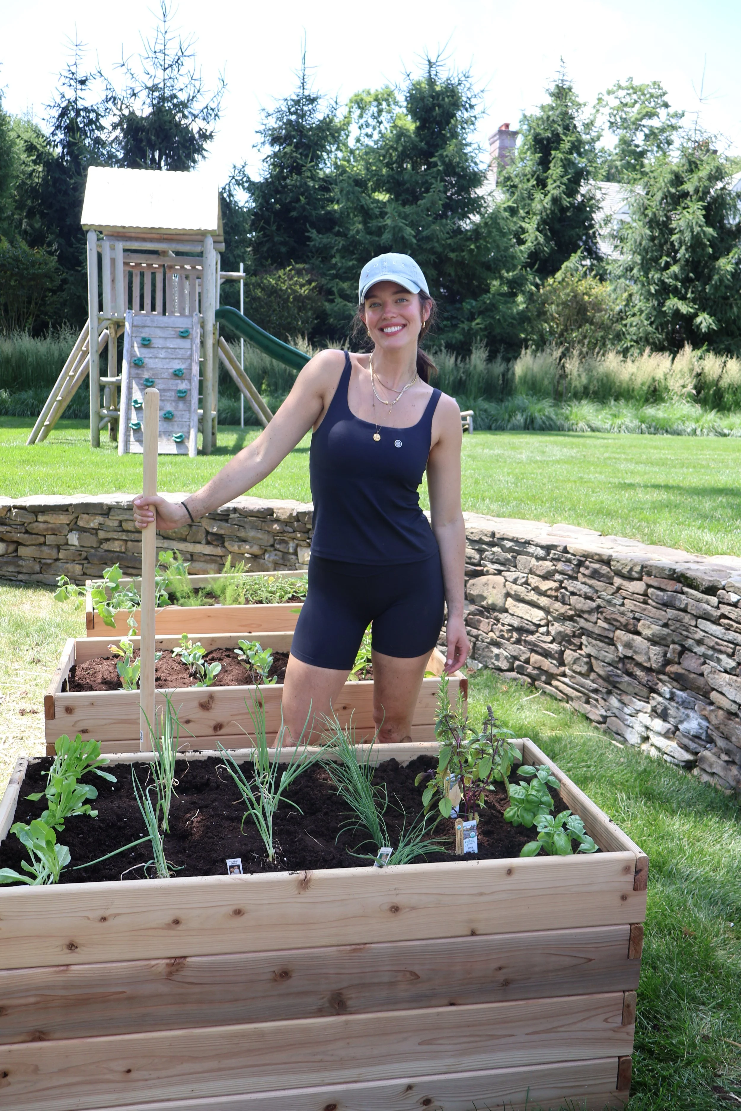 I ordered these cedar raised garden beds from Eartheasy, and I love them. I went with the 2’W x 4’L x 22”H size to fit our backyard space — and the height has been perfect for keeping little hands (and wildlife) out of the soil. Although I have had to put a deer fence around the beds after a very cute baby deer ate my cucumber plant!